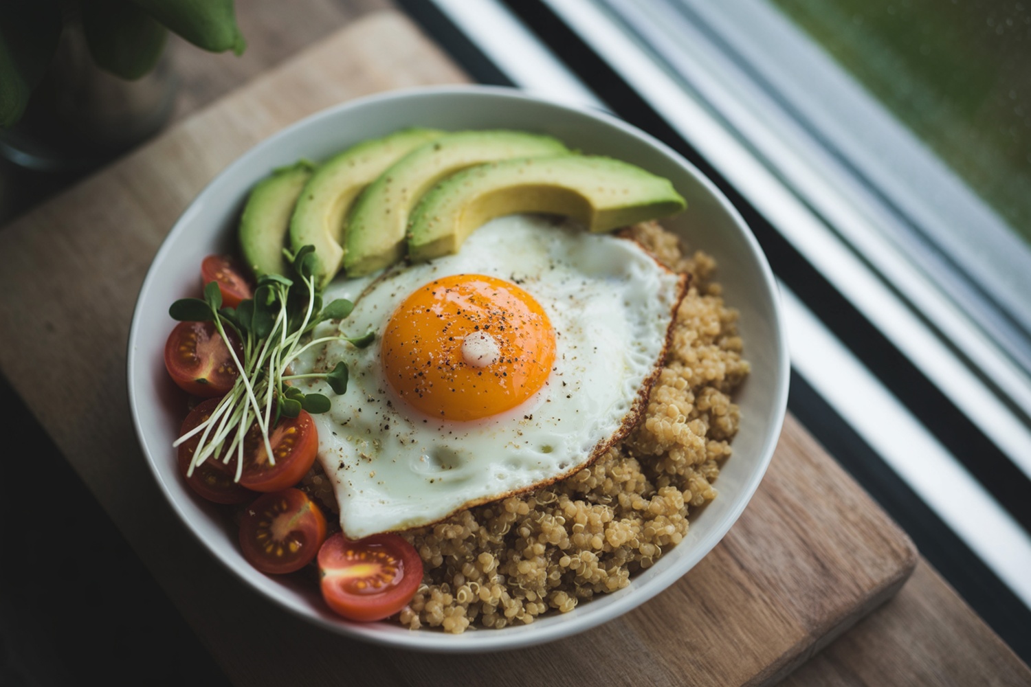 Arrange quinoa in bowl, top with eggs and spinach.